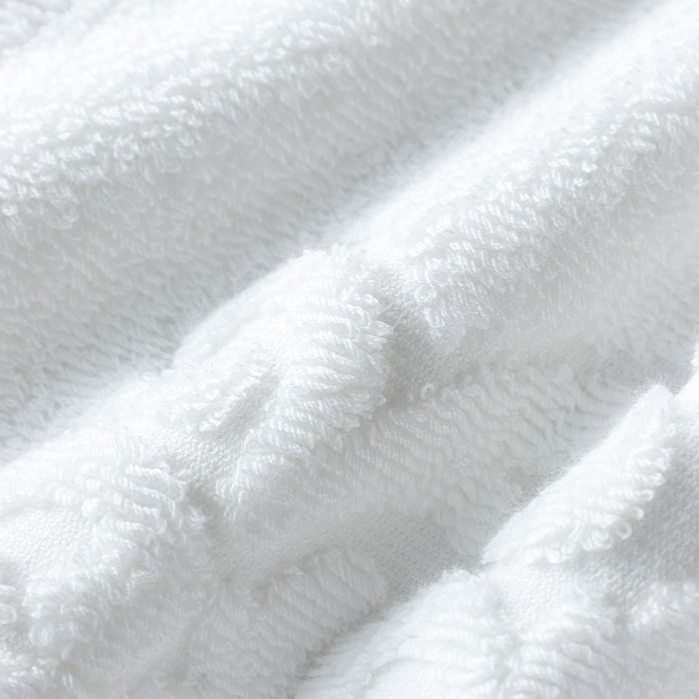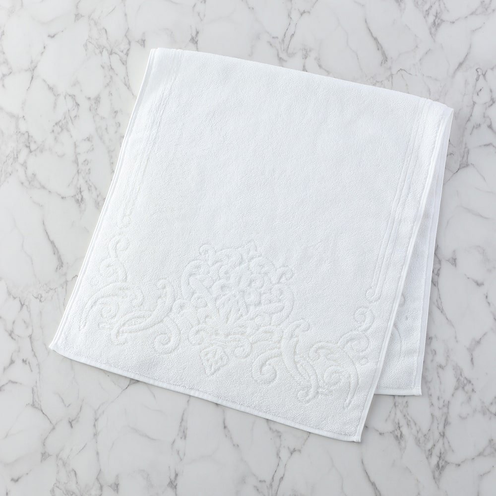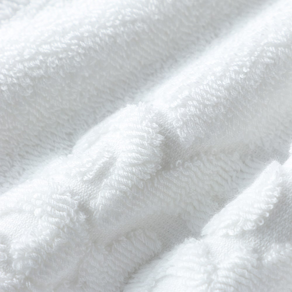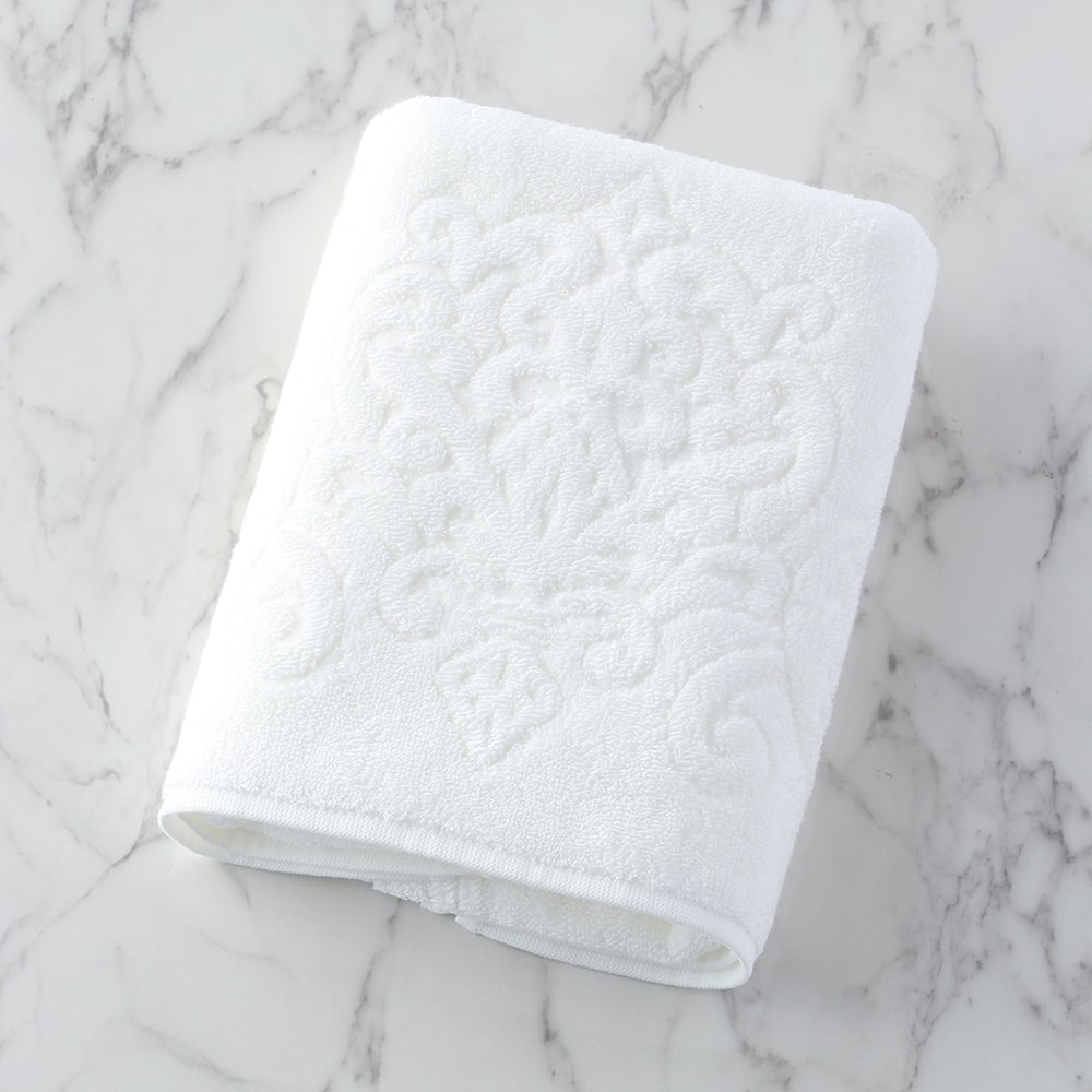The world's finest cotton, "Sea Island Cotton," nicknamed the jewel of fibers, is used for the pile portion. The gorgeous medallion pattern is tightly woven with 50-count double-ply yarn. This towel has a smooth, glossy finish that is unique to Sea Island Cotton, which has long fibers. Its texture feels like high-class cashmere. Although it is cotton, it has a dazzling silk-like lustre.